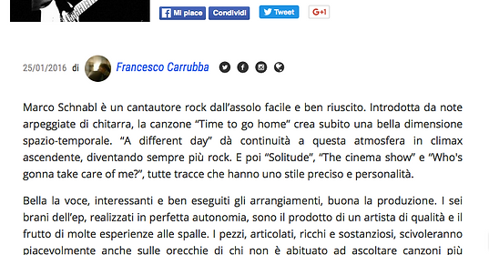 "Marco Schnabl is a rock singer/songwriter with an easy and fruitful guitar solo attitude. Introduced by arpeggiated guitar notes, the song "Time to go home" immediately creates a beautiful space/time scenario. "A different day" gives continuity to this atmosphere towards an ascending climax, becoming more and more rock. And then "Solitude," "The cinema show" and "Who's gonna take care of me?", all tracks that have a definite style and personality.
